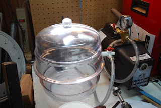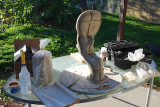 After prying the mold apart and carefully cleaning off the clay layup, I took the sculpture and a 5-gallon bucket of Silicone to my friend David Lea's. Dave has a really nice degassing machine that removes the unwanted air from the silicone (first image bellow). Doing this extends the life of a mold. We carefully put the mold jackets back over the hatch sculpture and sealed it using plaster bandages. I remember after pouring the mold we had a hell of a time plugging the holes we used for letting the air escape. Silicone was everywhere! That night I learned to NEVER drill 1/4inch holes to bolt a mold together, it leaks. From now on I will clamp the mold together. Thank god for David's help that night!