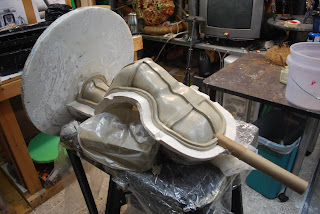 After prying the mold apart and carefully cleaning off the clay layup, I took the sculpture and a 5-gallon bucket of Silicone to my friend David Lea's. Dave has a really nice degassing machine that removes the unwanted air from the silicone (first image bellow). Doing this extends the life of a mold. We carefully put the mold jackets back over the hatch sculpture and sealed it using plaster bandages. I remember after pouring the mold we had a hell of a time plugging the holes we used for letting the air escape. Silicone was everywhere! That night I learned to NEVER drill 1/4inch holes to bolt a mold together, it leaks. From now on I will clamp the mold together. Thank god for David's help that night!